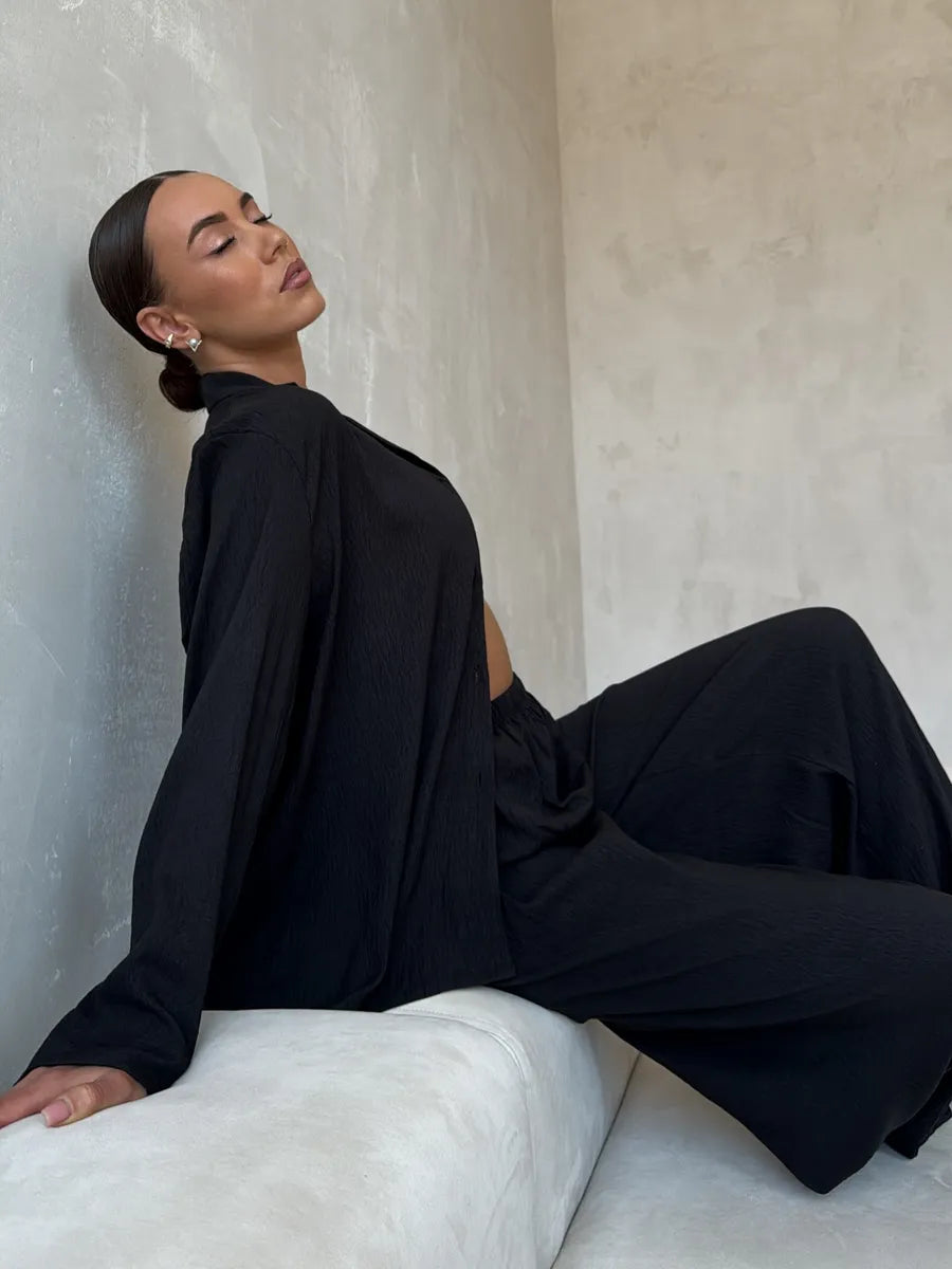 تصميمها العصري المكوّن من قميص بأزرار وبنطلون واسع يوفّر لكِ حرية الحركة ويجمع بين البساطة والفخامة، لتناسب ارتدائها في المنزل أو أثناء الاسترخاء.