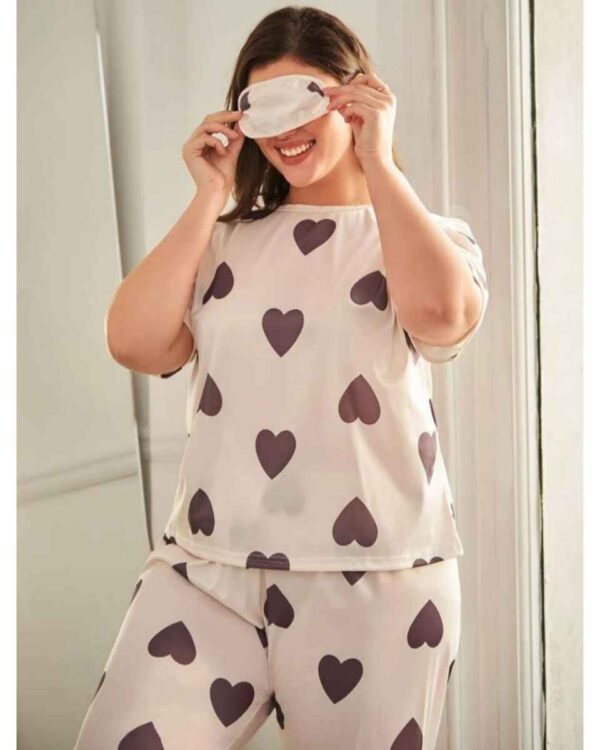اختاري طقم البيجامة البيج بطبعة القلوب لإطلالة منزلية أنيقة، تمنحك إحساسًا بالراحة والنعومة طوال اليوم